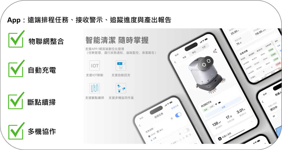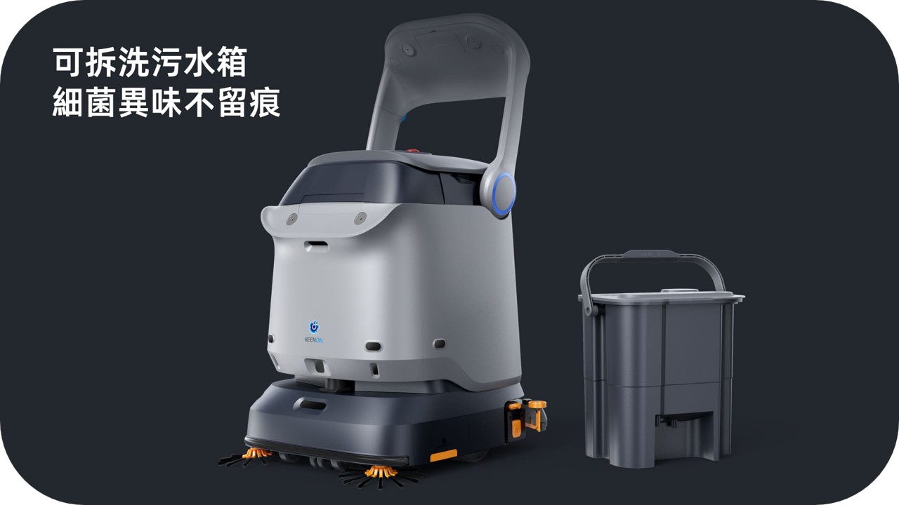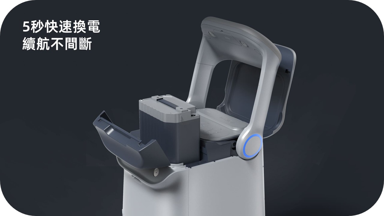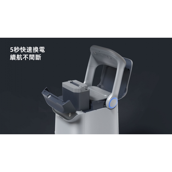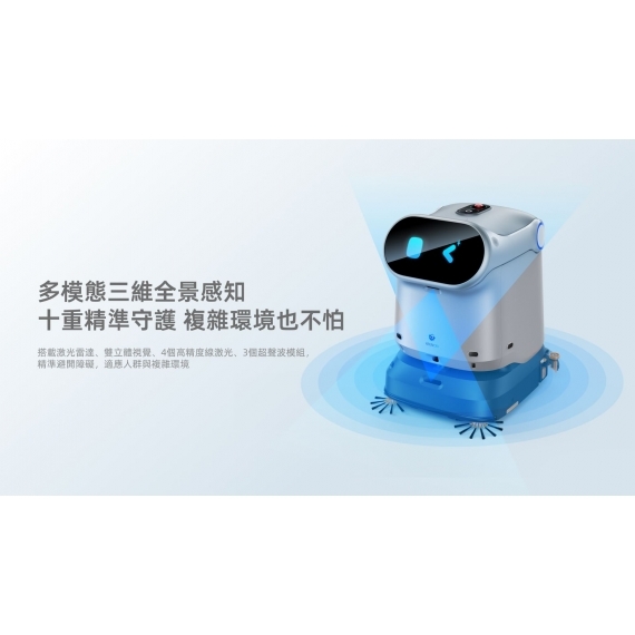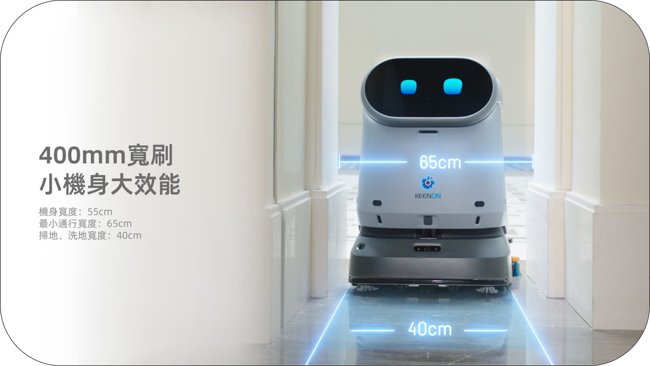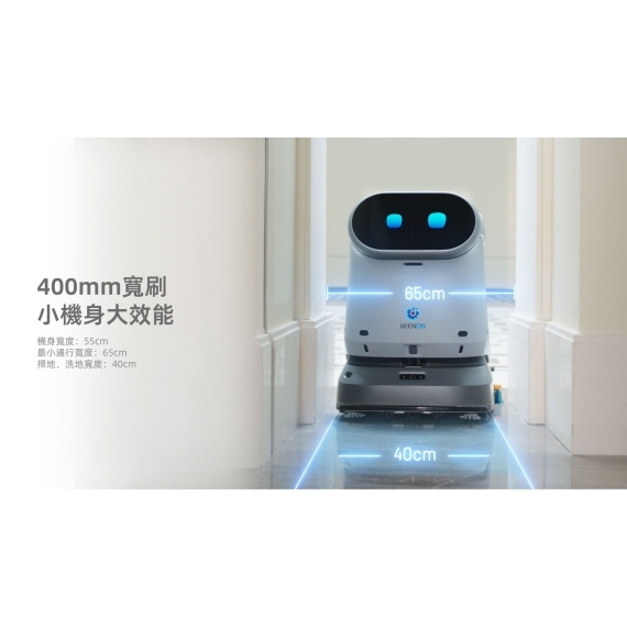 四合一智能清潔機器人,整合掃地、吸塵、洗地與乾燥功能,一機完成全流程清潔。專為中小型商用空間打造,最小通行寬度僅 65 公分。